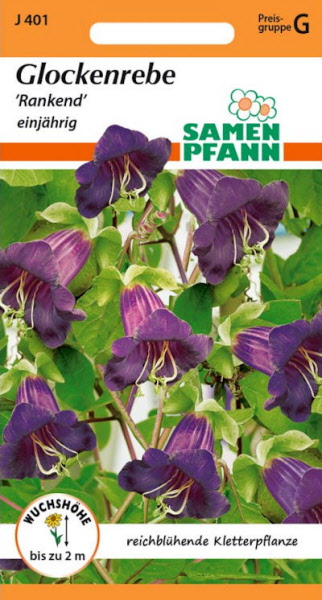 Glockenrebe Rankend Cobaea scandensRasch wachsende, einjährige Kletterpflanze mit großen glockenförmigen violetten Blüten. Für Spaliere, Pergolen, Balkone und Lauben.