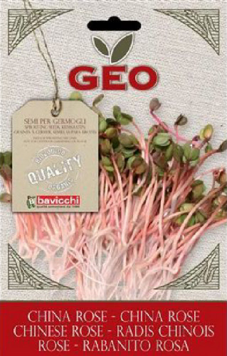 Rosa Radieschen Sprossen sind sehr nährstoffreich, insbesondere enthalten sie viele Vitamine (A, B1, B2, C und PP) und Mineral-salze (Eisen, Kalium, Kalzium, Magnesium, Natrium und Phosphor). Sie haben einen scharfen Radieschen Geschmack, sind aber immer noch weniger stark als die anderen Sorten.