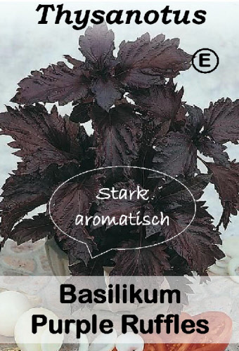 Ocimum basilicum. Sehr große, längliche gekerbte, purpurviolette glänzende Blätter, ein wenig blasig, sehr duftend und dekorativ. Die Verbesserung von Dark Opal und sehr aromatisch. Kultur in Töpfen, im Hochbeet oder im Gemüsebeet.